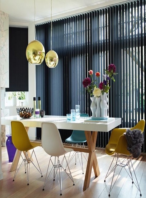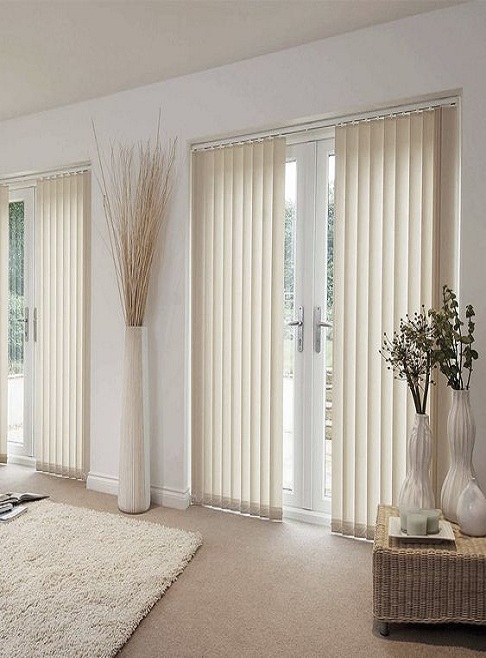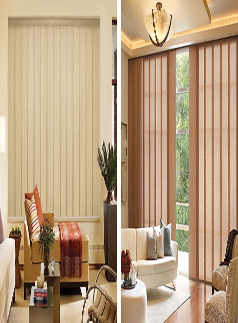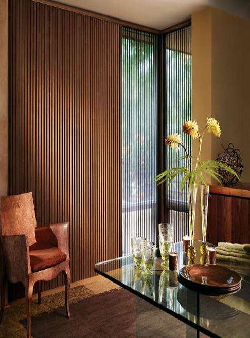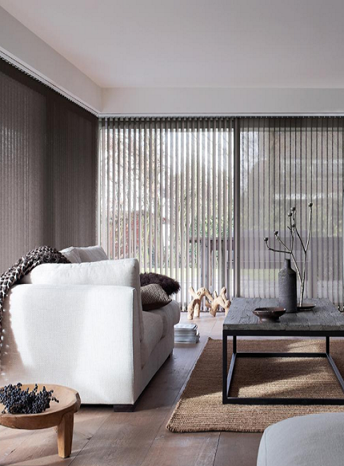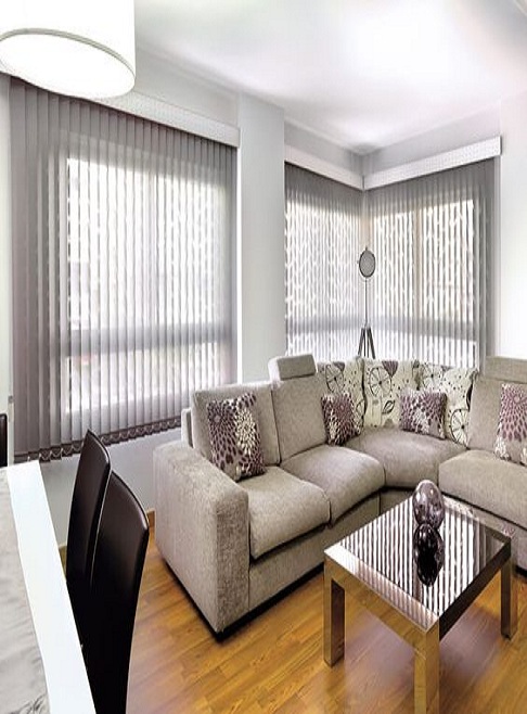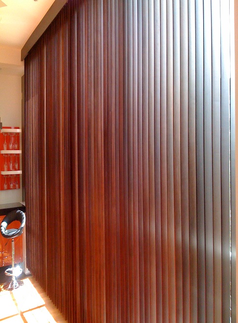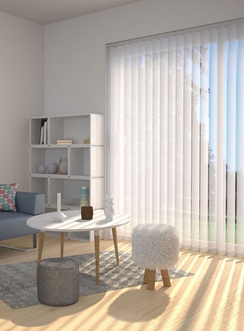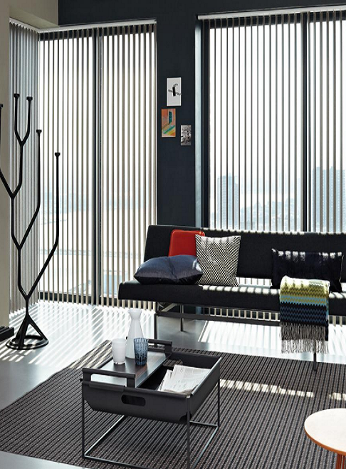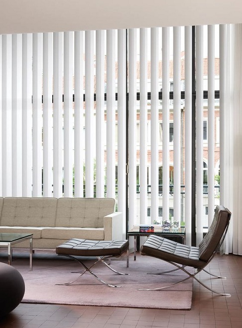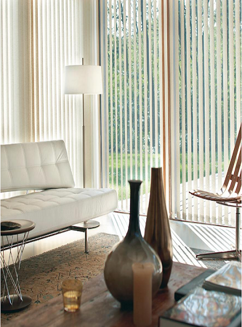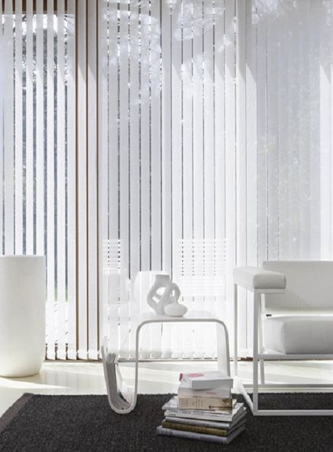Creado por las lamas de las persianas verticales que cuelgan de un riel y la forma como se mueve y giran permiten que haya un manejo muy eficiente de luz y privacidad.